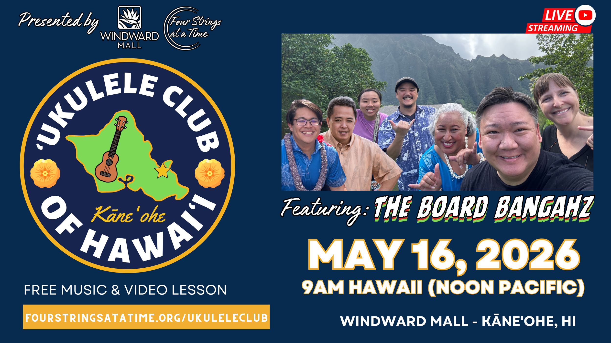 Join us for our flagship program, ‘Ukulele Club of Hawai‘i! It’s 100% free and anyone can join in the jam. Club typically meets every 3rd Saturday of the month at Windward Mall (Kāne‘ohe. HI) and is livestreamed for all of our island neighbors and beyond. To prepare for the jam, don’t forget to download the free music sheets and watch the video mini-lesson prior to our meeting (when available). Visit Club’s main page for more information:
