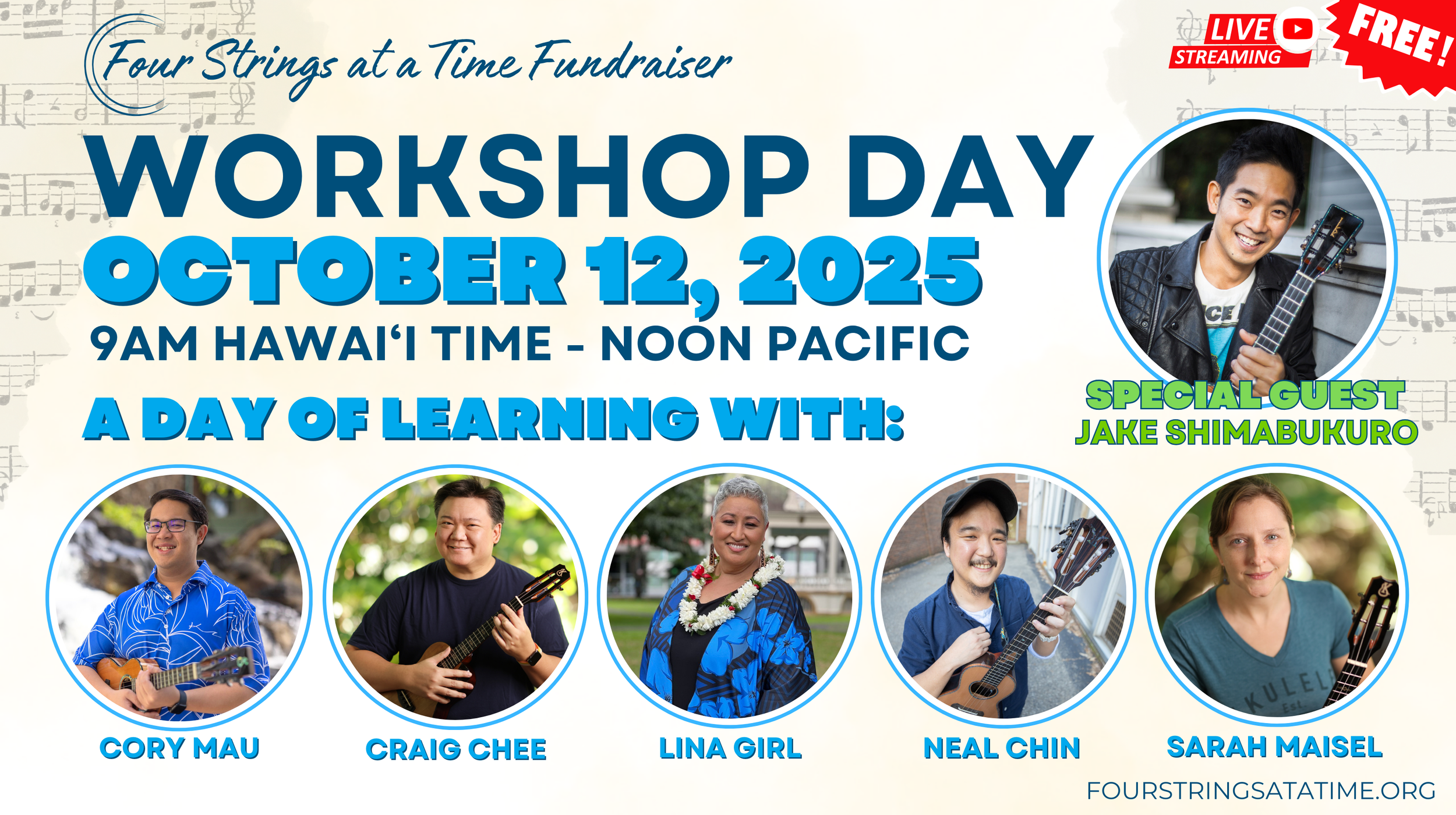 Mark your calendars! We're hosting a free Workshop Day on October 12, 2025, featuring a lineup of world-class artists, including the one and only Jake Shimabukuro! Join him and other amazing instructors—Cory Mau, Craig Chee, Lina Girl, Neal Chin, and Sarah Maisel—for a full day of ‘ukulele learning.